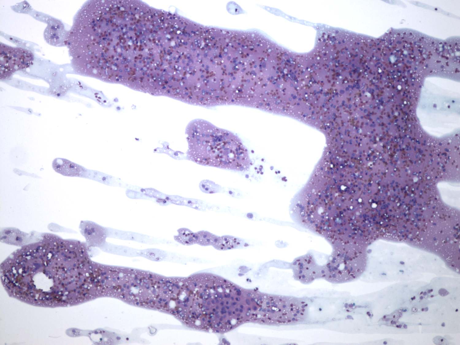 Pap-smear, 100x. Lymphoid cells and groups of thyrocytes predominate the smear.