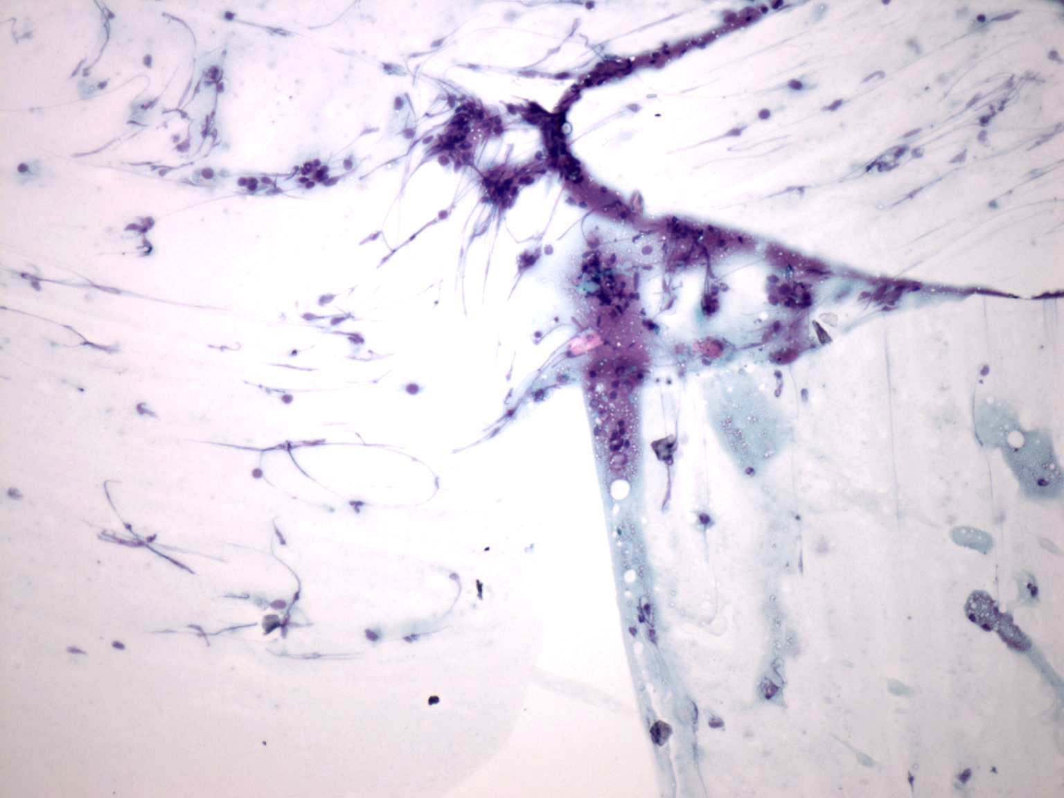 Pap-smear, 100x. Inflammatory cells and nuclear debris.