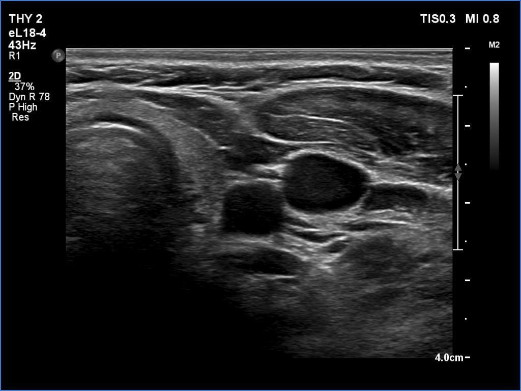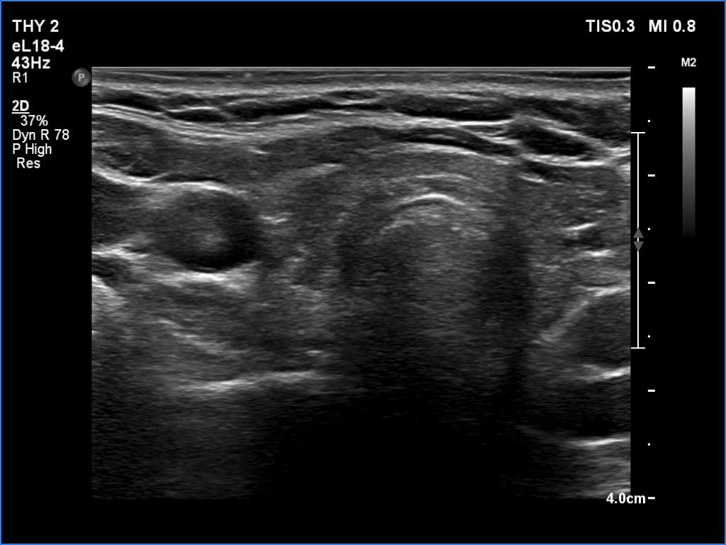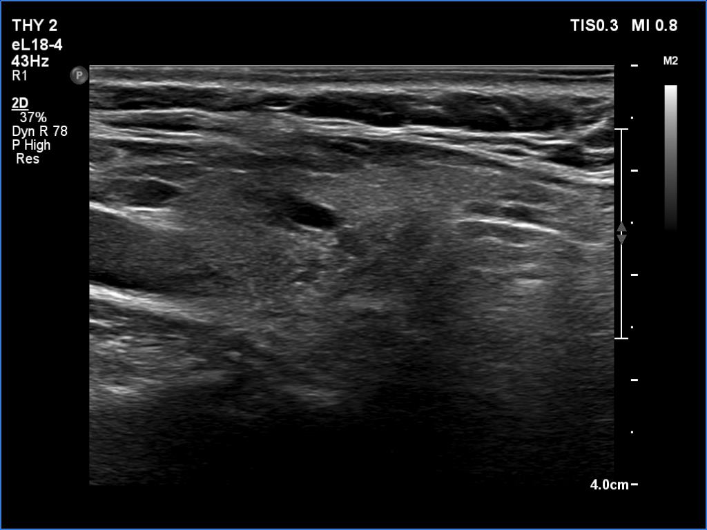 Clinical presentation: A 29-year-old woman was referred for an evaluation of neck complaints. She has noticed tenderness in the left side of the neck 3 weeks. One week prior to the examination, pain appeared in the right thyroid. Her body temperature was normal as was the erythrocyte sedimentation rate and CRP, 14 mm/H and 4.1 mg/L (normal value 0-4.8), respectively.