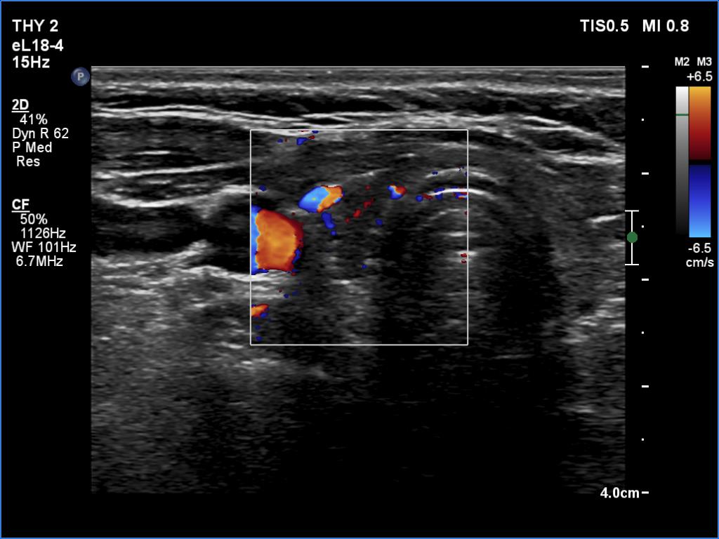 Ultrasonography: Compared with the last examination, the thyroid was less hypoechoic. The vascularization was decreased.
