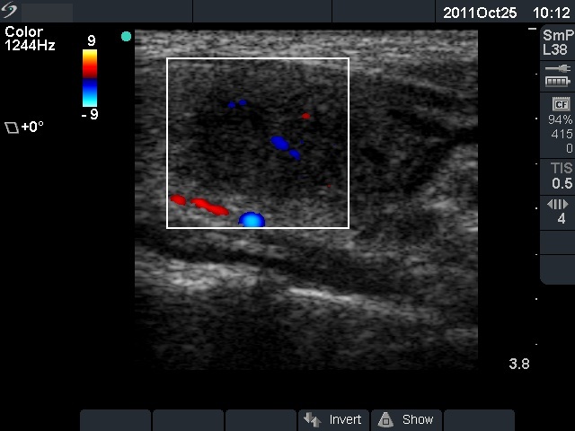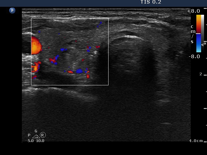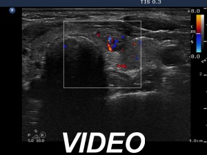 The ultrasound pattern of de Quervain's thyroiditis and that of papillary cancer are very similar: a hypoechogenic lesion with blurred borders are found in both cases. They differ in vascularization statistically but the vascular pattern has only limited practical significance. In the acute phase of de Quervain's thyroiditis the vascularization is generally decreased but even in this case the situation was the opposite. The finding of not one but multiple hypoechogenic areas favored the possibility of subacute thyroiditis.