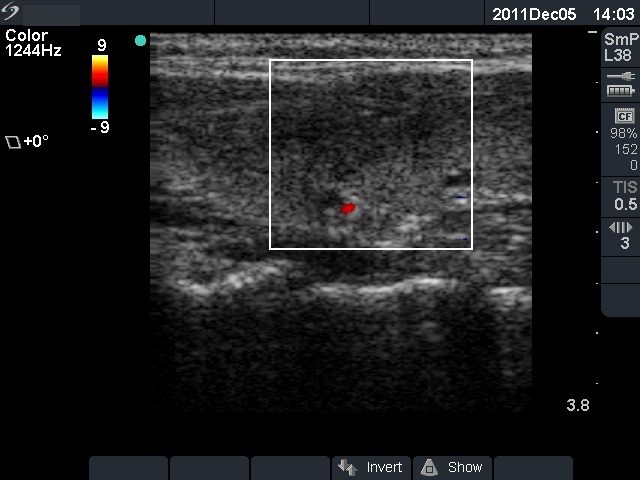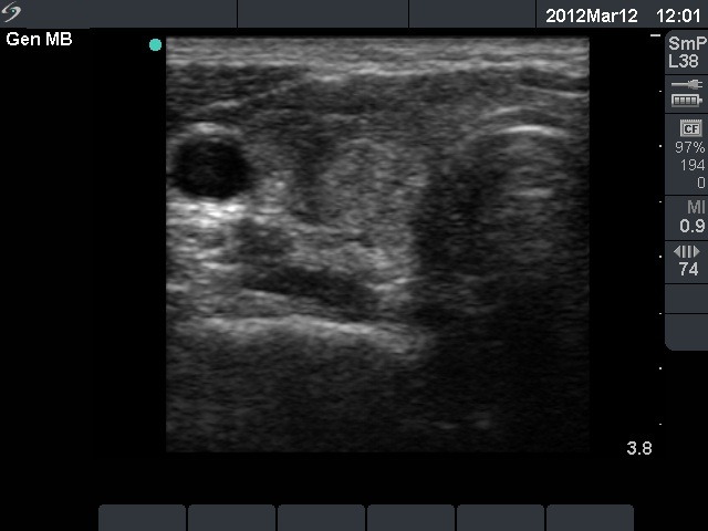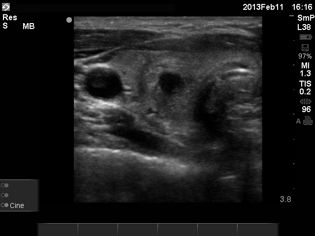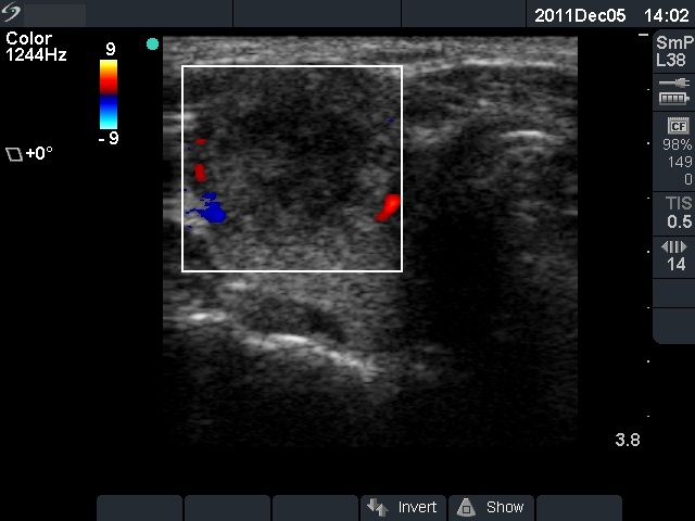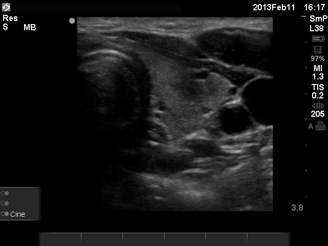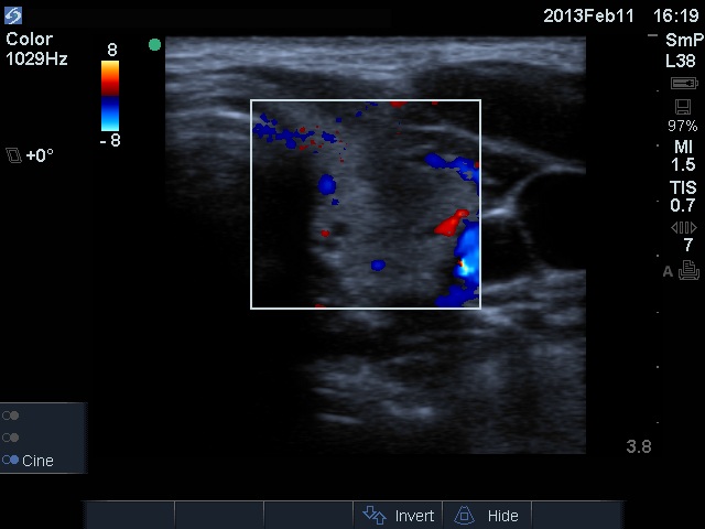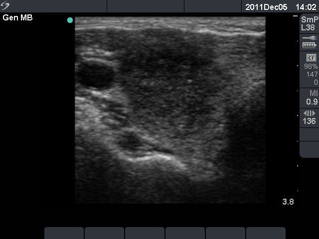 Ultrasonography: The right thyroid was echonormal and contained several small, insignificant lesions. There was a hypoechogenic lesion with blurred borders in the central and in the ventro-medial part of the left thyroid with increased intranodular blood flow.