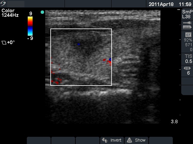 Left lobe, longitudinal scan, color Doppler mode. Practially, there is no vascularization on Doppler mode.
