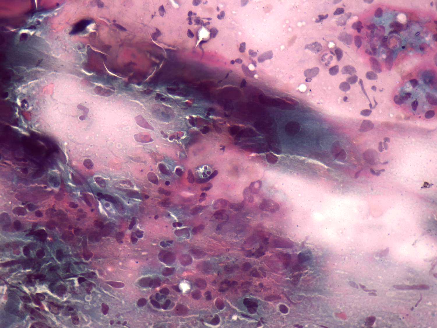 Pap-smear, 400x. Typical presentation of a de Quervain's thyroiditis: multinucleated cells, various inflammatory cells including epithelioid cells are on the smear.