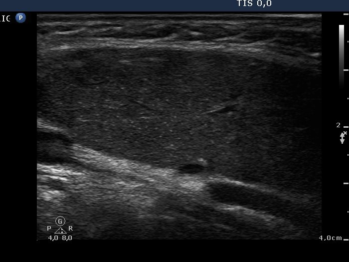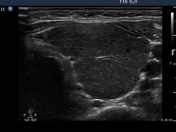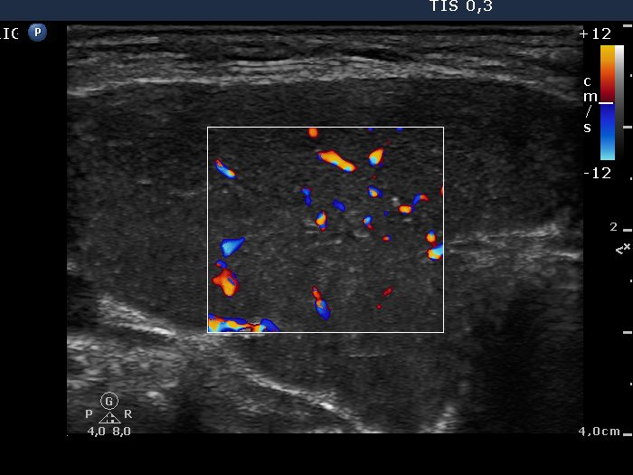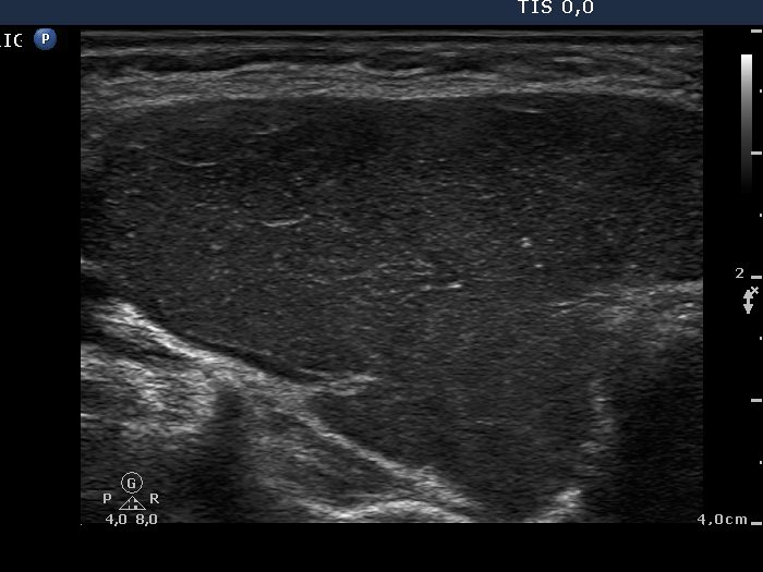Ultrasonography: A hypoechogenic, inhomogeneous thyroid was found with increased vascularization.