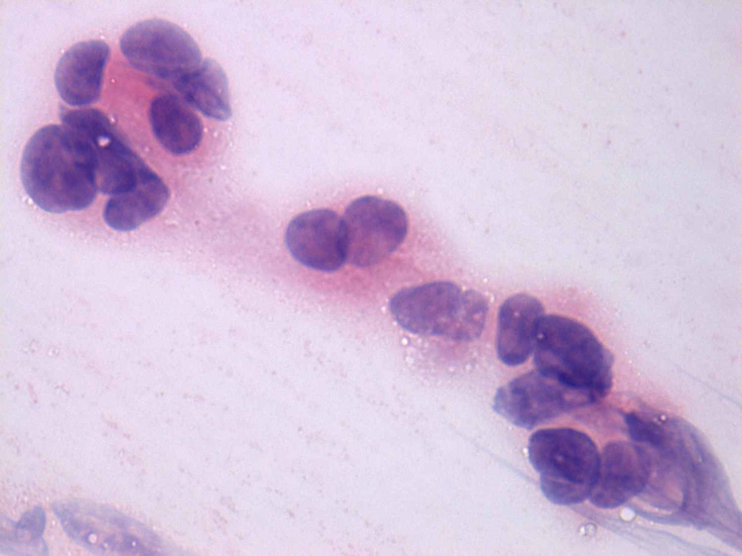 Pap-smear, 1000x. Oxyphilic cells display anisonucleosis and mild degree of pleomorphism but do neither inclusions nor grooves nor prominent nucleoli.