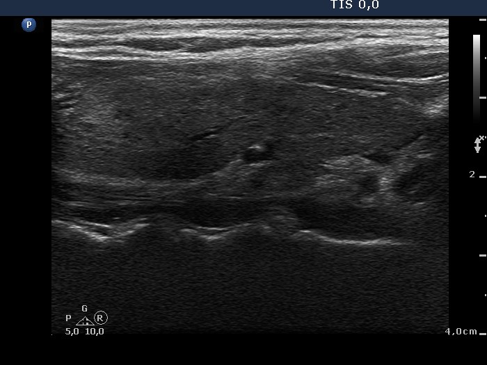 Right lobe, longitudinal scan. There are multiple hypoechogenic areas in the moderately hypoechogenic lobe.