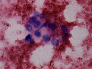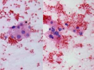 Cytological diagnosis: benign pattern corresponding to previous dysfunction and isotope therapy.