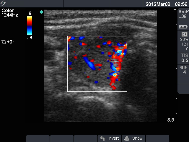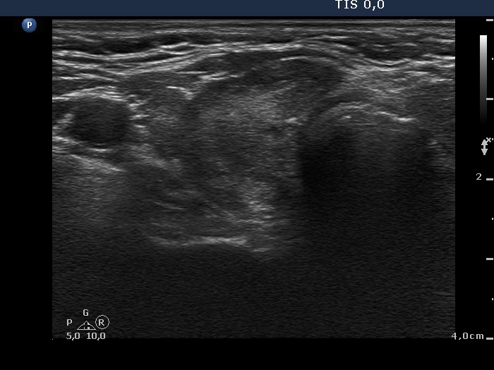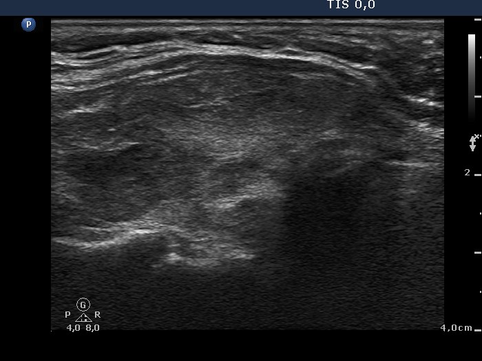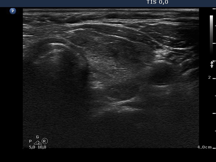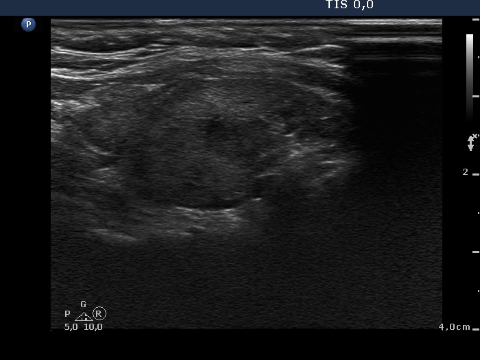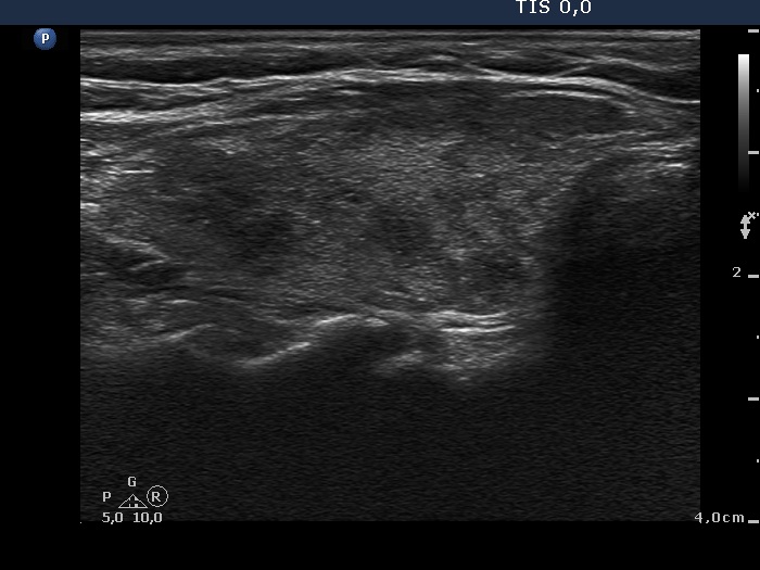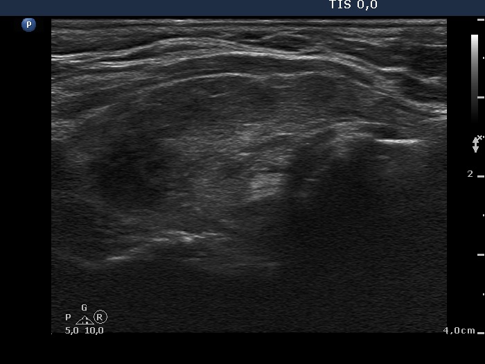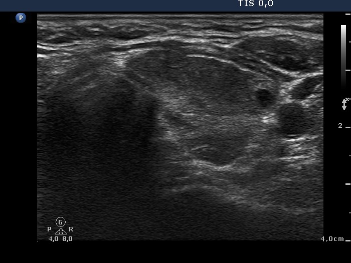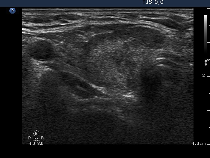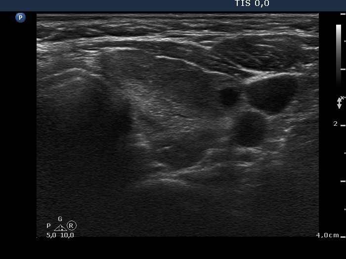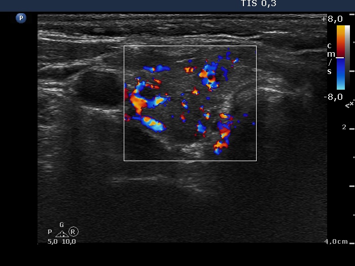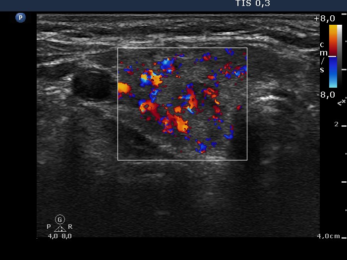 Comment. It is worth analyzing the echo pattern of the thyroid. The small hypoechogenic area in the right lobe changed neither in size nor is shape nor in vascularization over 11 months.