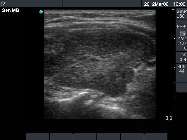 Ultrasonography: The extent of hypoechogenic areas have decreased, otherwise the pattern was unchanged.We suggested again a repeat radioiodine therapy.