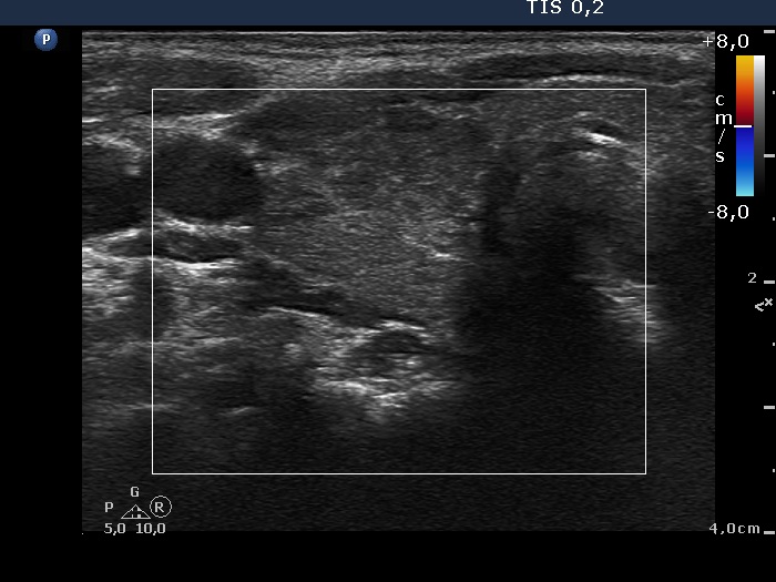 Ultrasonography: The thyroid was echonormal and had several small hypoechoic areas. The discrete lesion in the right lobe has not changed.