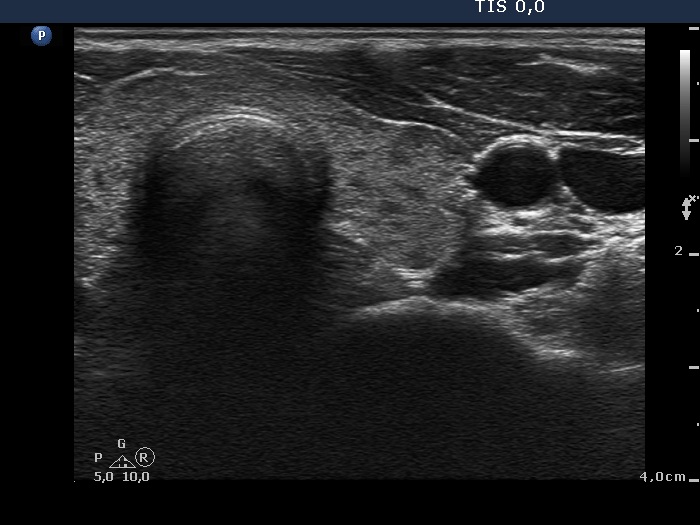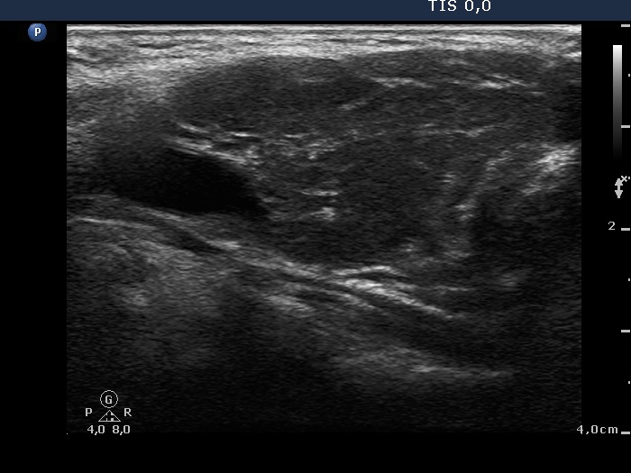 The discrete lesion which has appeared at the third examination is either an echonormal nodule or that part of the thyroid which is not influenced by the underlying autoimmune thyroid disease.