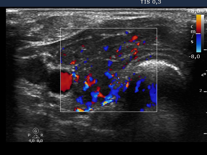 Ultrasonography: A diffusely hypoechogenic thyroid was found with several discrete lesions. The vascularization was increased.