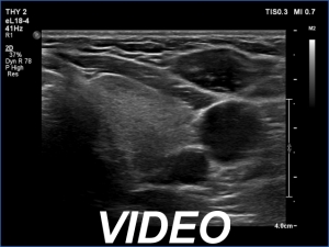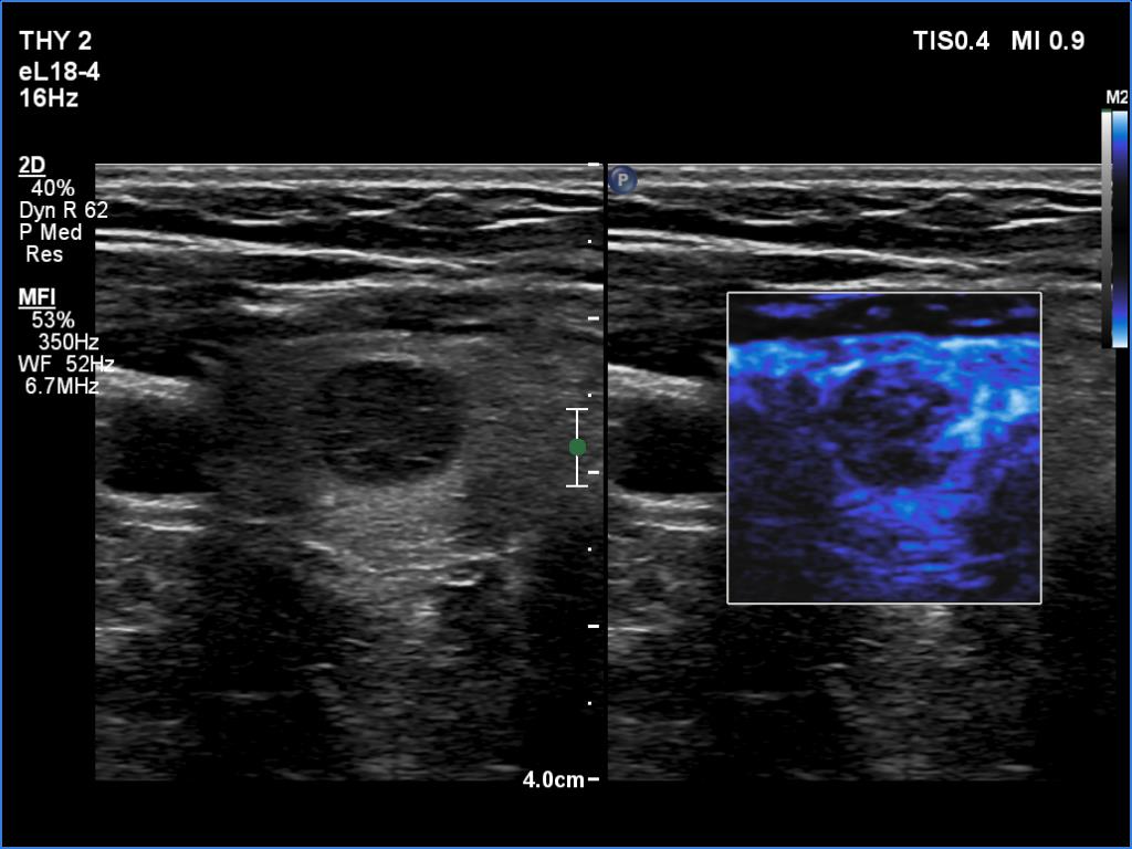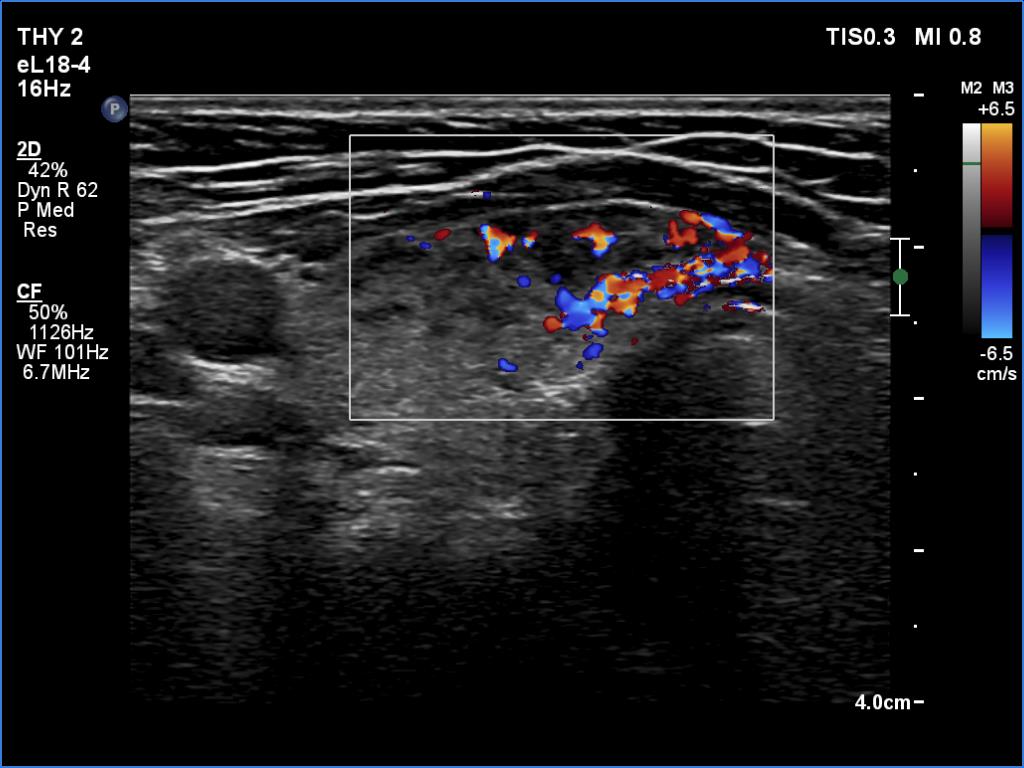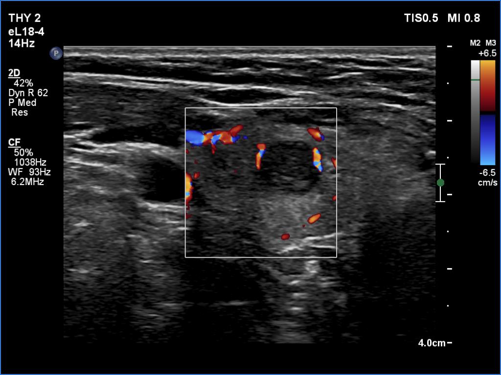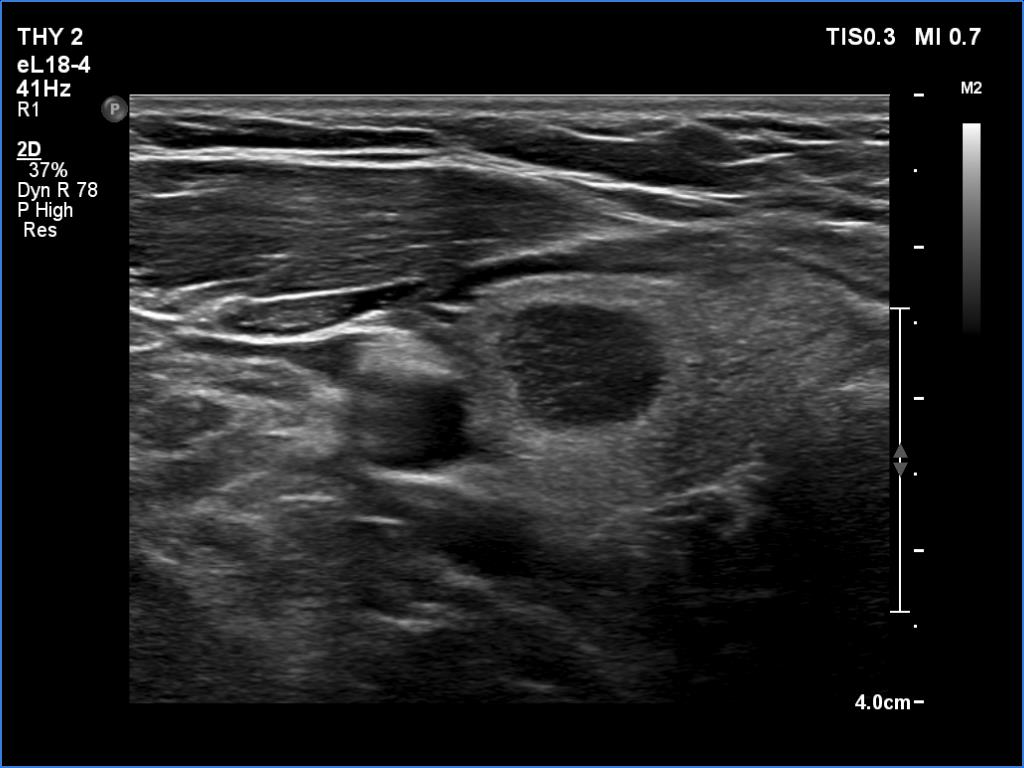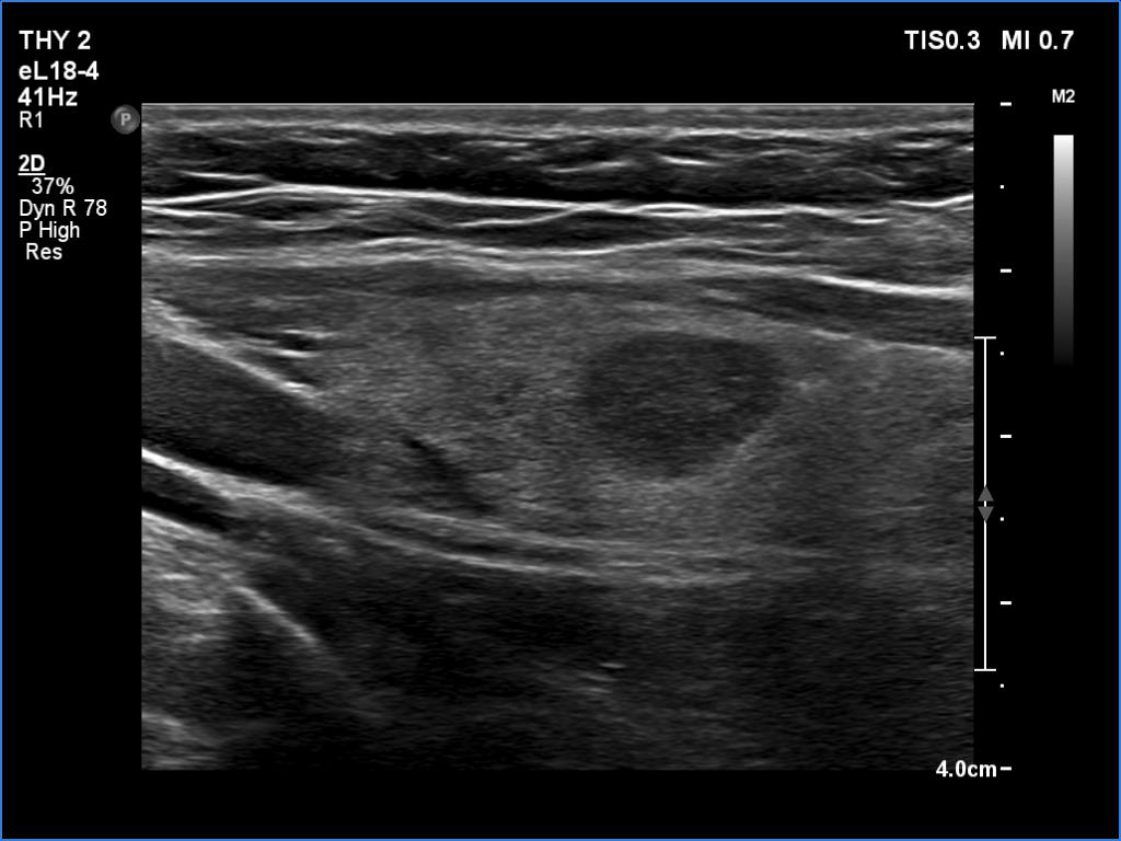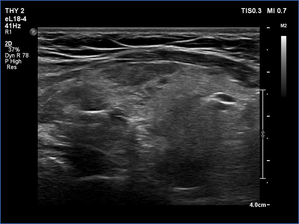 Comment. It is worth comparing the deeply hypoechoic nodule with the other discrete lesions. The former has regular, sharp borders, and its echogenicity differs from other areas of the thyroid. These are the main clues of differentiation of a true nodule from a discrete lesion of Hashimoto's thyroiditis.