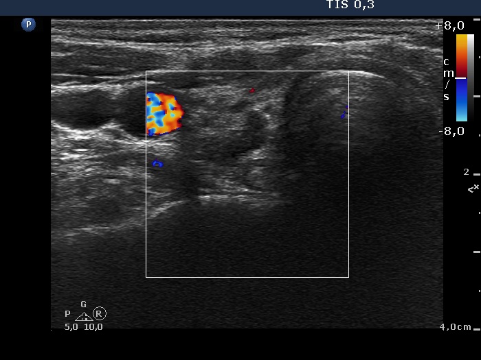 Right lobe, transverse scan, color Doppler mode. The vascularization is decreased.