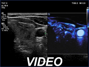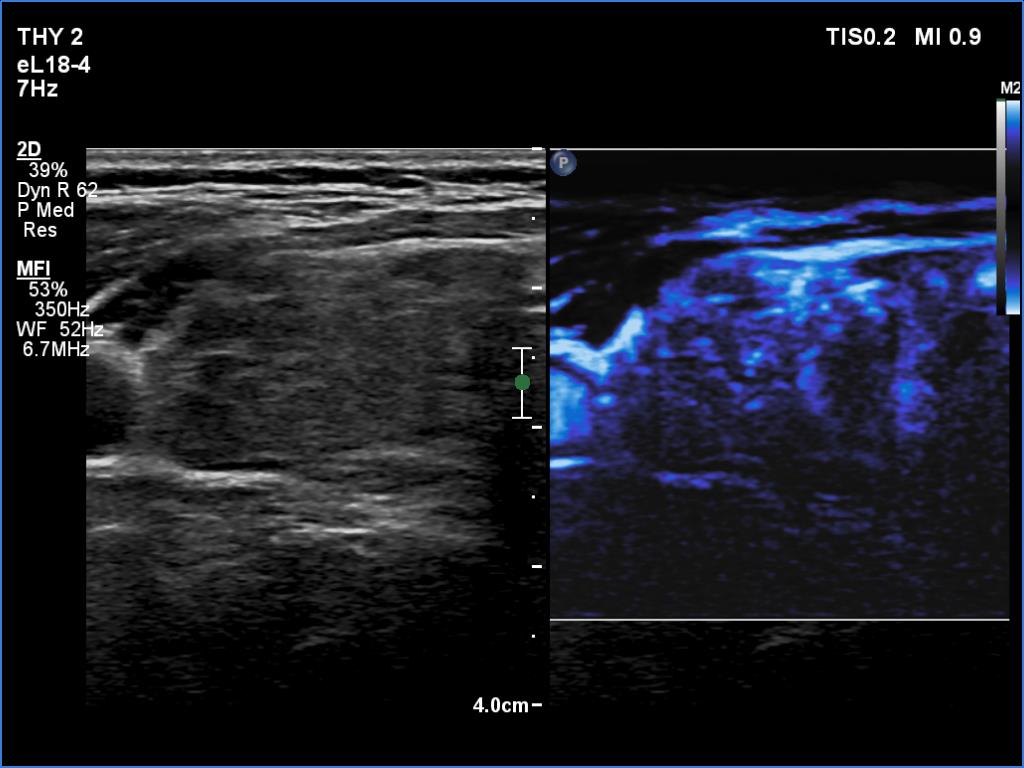 Ultrasonography. The thyroid was minimally hypoechoic and had several discrete areas of various echogenicities. None of these lesions corresponded to true nodule.