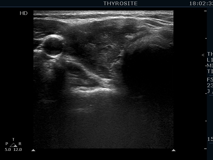 Ultrasonography. The thyroid was echonormal and presented numerous hypoechogenic discrete areas. The echogenicity index was approximately 30%. None of the discrete areas corresponded to pathological nodule. The vascularity was a bit lower than the average.