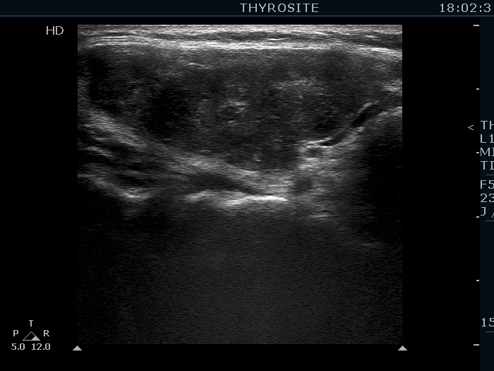 Comment. This is a typical presentation of a newly developed hypothyroidism regarding the change in echo pattern. Although the correlation between the echogenicity index and the hormonal status is week, in a particular patient, a developing hypothyroidism from an euthyroid state usually correlates with an increasing echogenicity index.Clinical data: This time the patient had no complaints, however the TSH was 16.8 mIU/L two month ago.