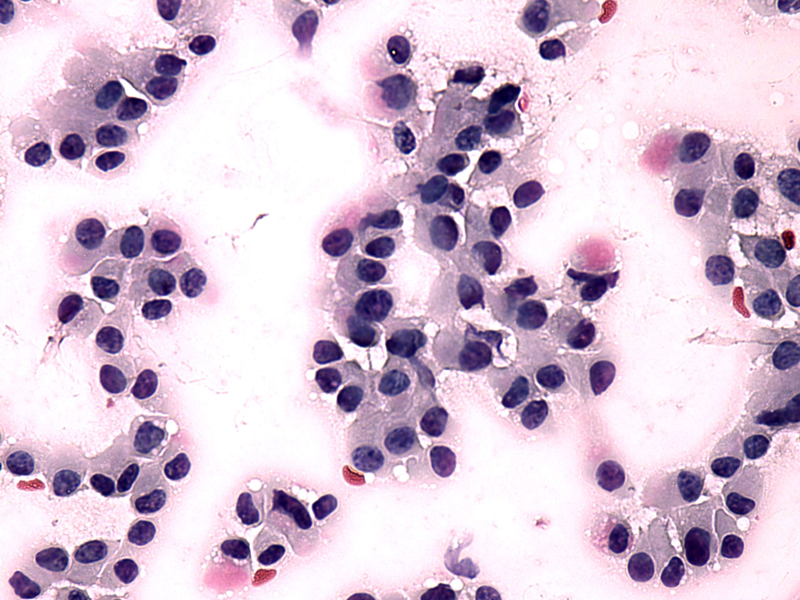 Pap-smear, 400x. Several dark, hyperchromatic nuclei can be seen.