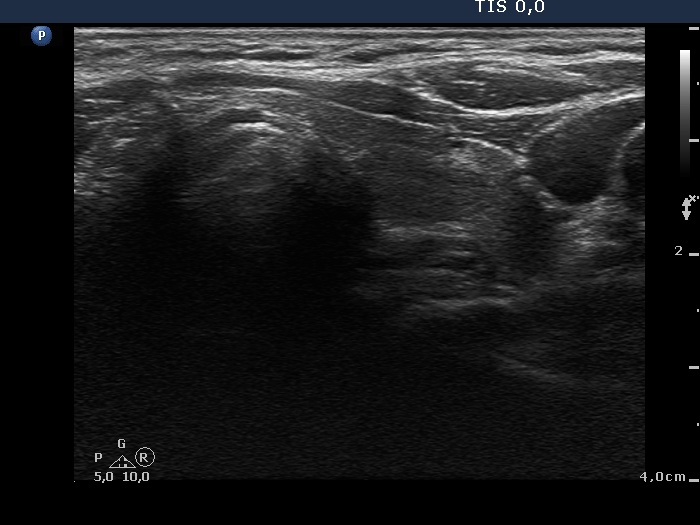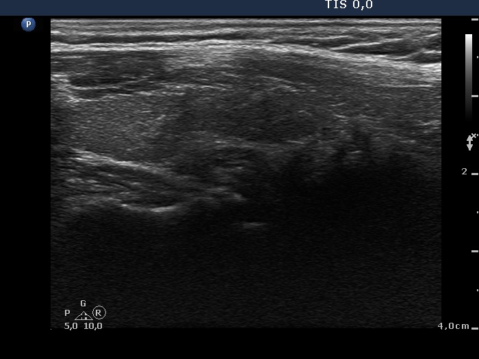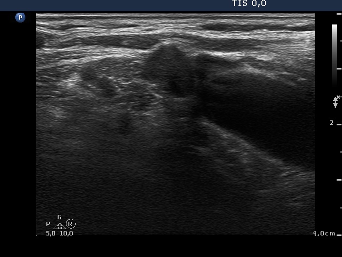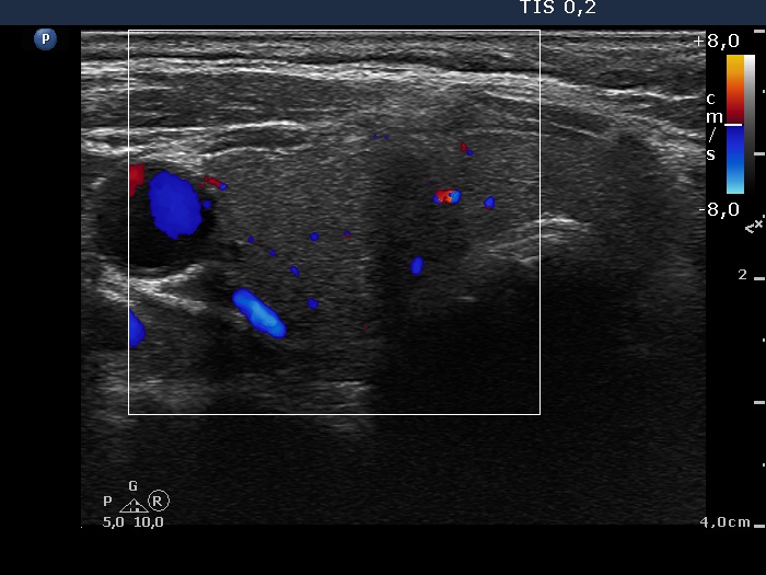 Ultrasonography: the right thyroid was echonormal while the left lobe contained moderately hypoechogenic areas with a 50% echogenicity index. There was a hypoechogenic mass lower and lateral to the right thyroid. The lesion did not present a regular hilum.