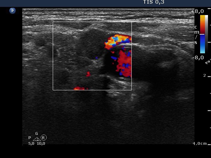 Lateral to the right thyroid, transverse scan, color Doppler mode. The node presents a type 1 vascular pattern.