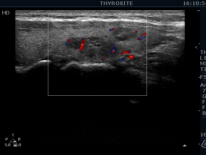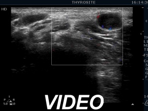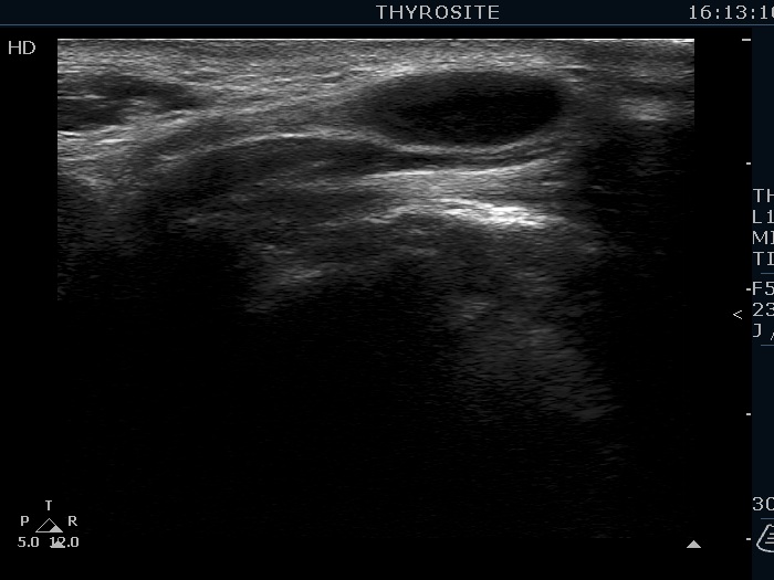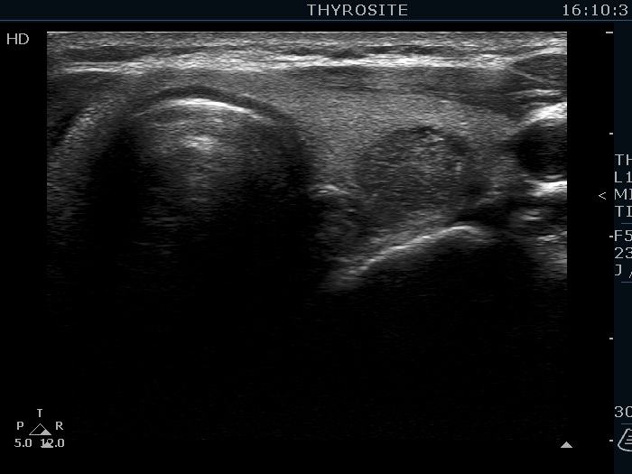 Ultrasonography. The thyroid was echonormal. There were several hypoechoic nodules in the left lobe. The middle one had back wall cystic figures. There were 3 or four discrete, deeply hypoechoic lesions above and lateral to the left lobe in the neck. One of them presented with a hilum-like figure while the others lacked hilum.