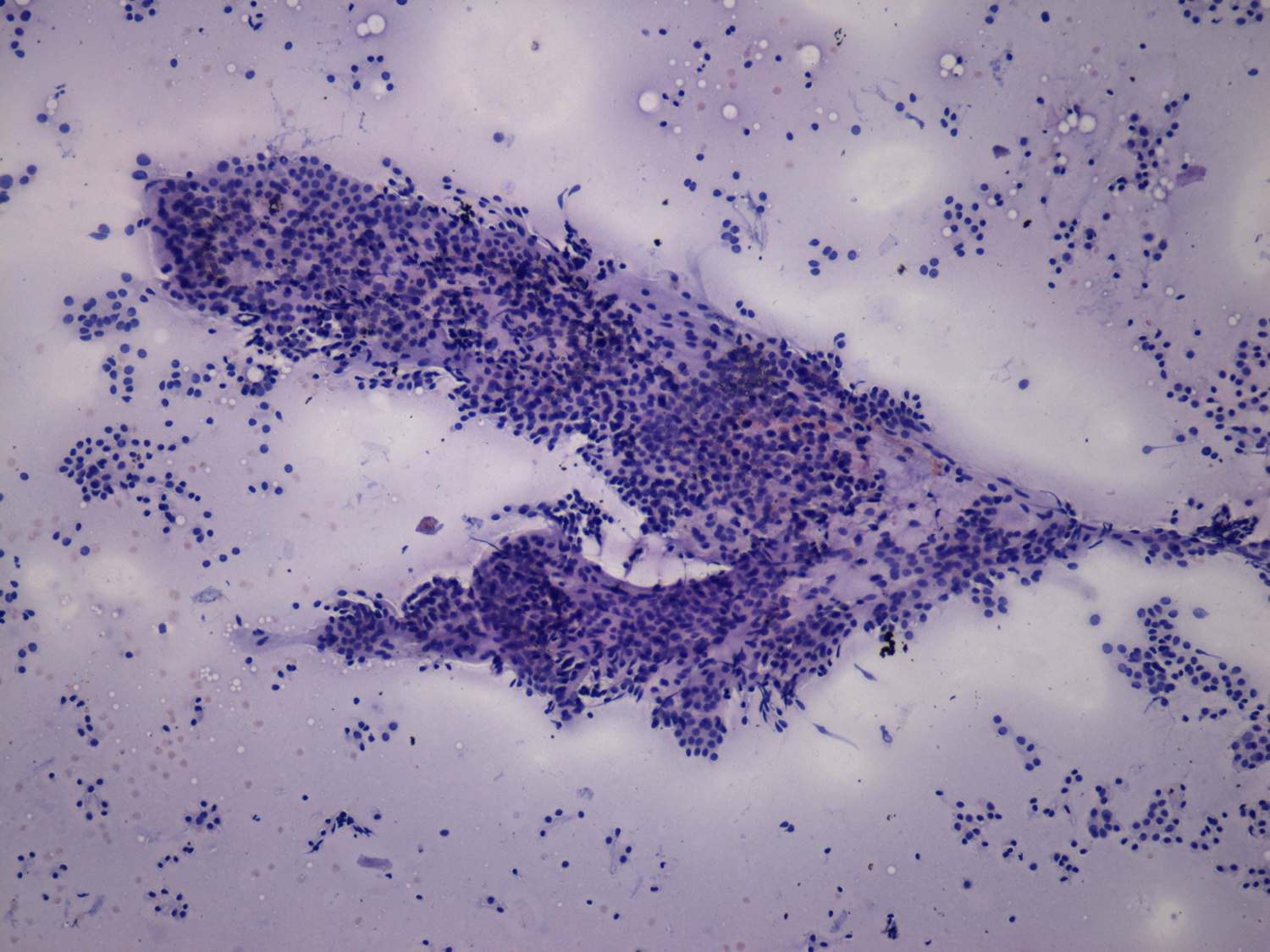 Pap-smear, 100x. There is diffuse colloid precipitate in the background. Follicular cells occur in hyperplastic papillary fragments, in microfollicles and dissociated.