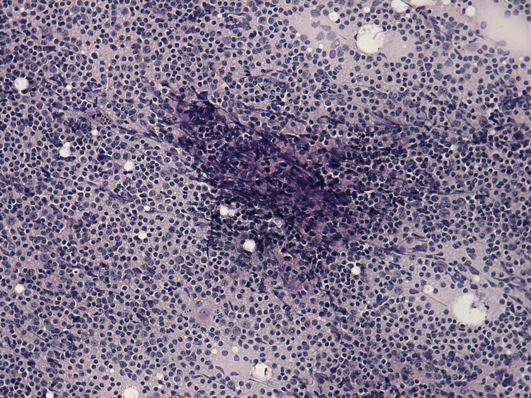 Pap-smear, 200x. Heterogeneous lymphoid cells, sinusoidal elements and macrophages can be seen.
