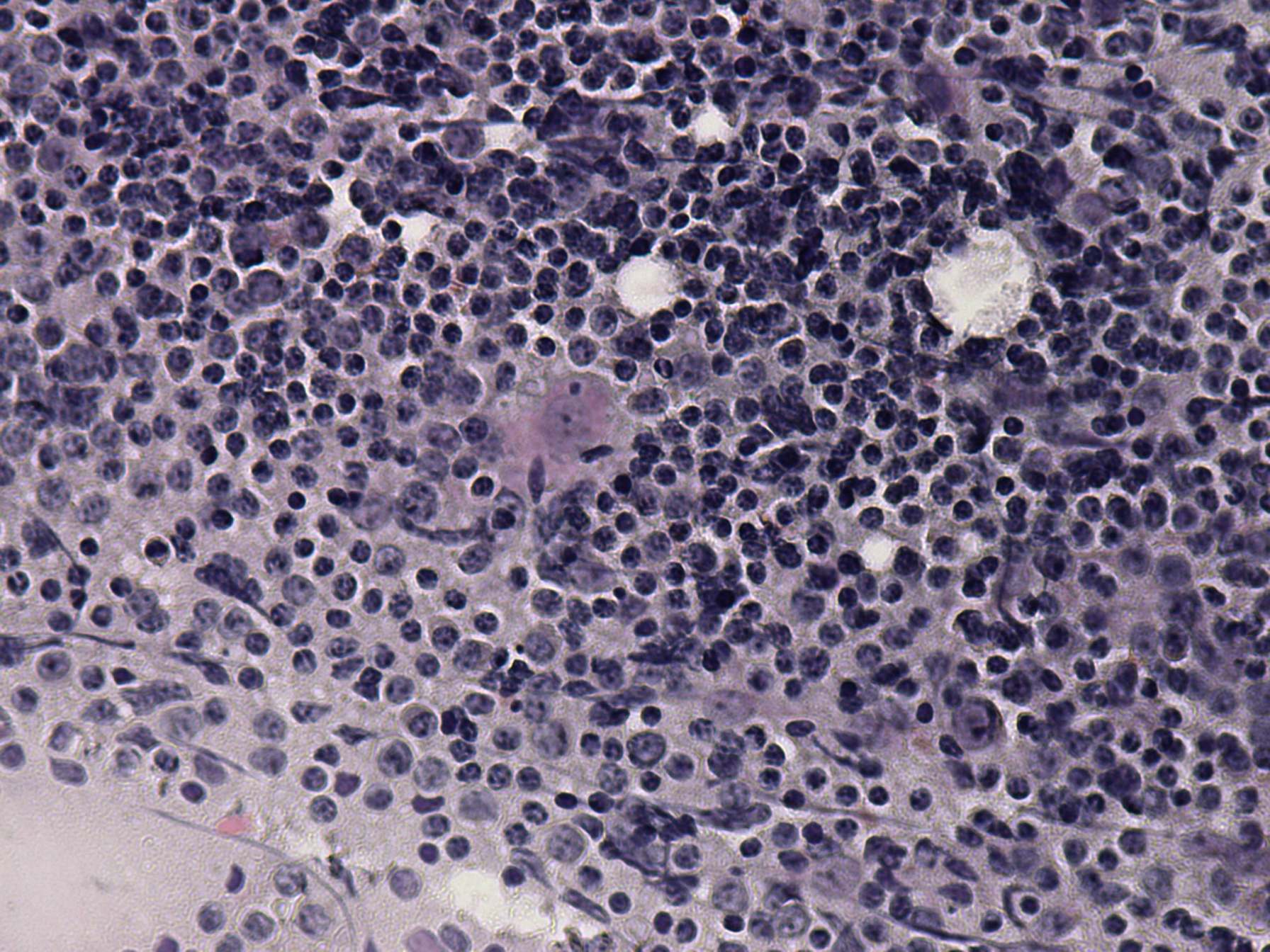 Pap-smear, 400x. There is a tingible body macrophage in the center of the image.