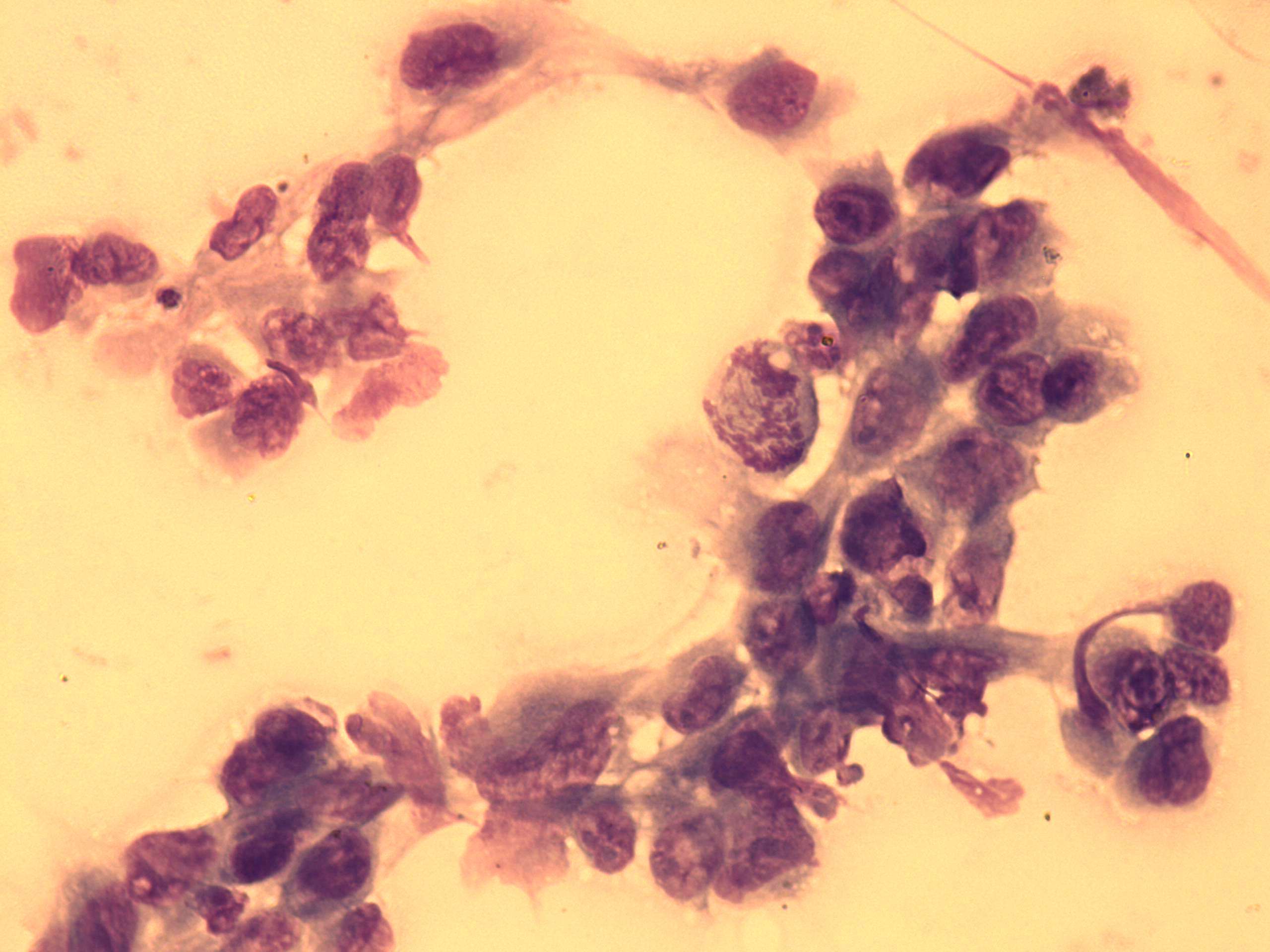 Wright-Giemsa staining, 400x. There is a single cell necrosis in the central part of the image.