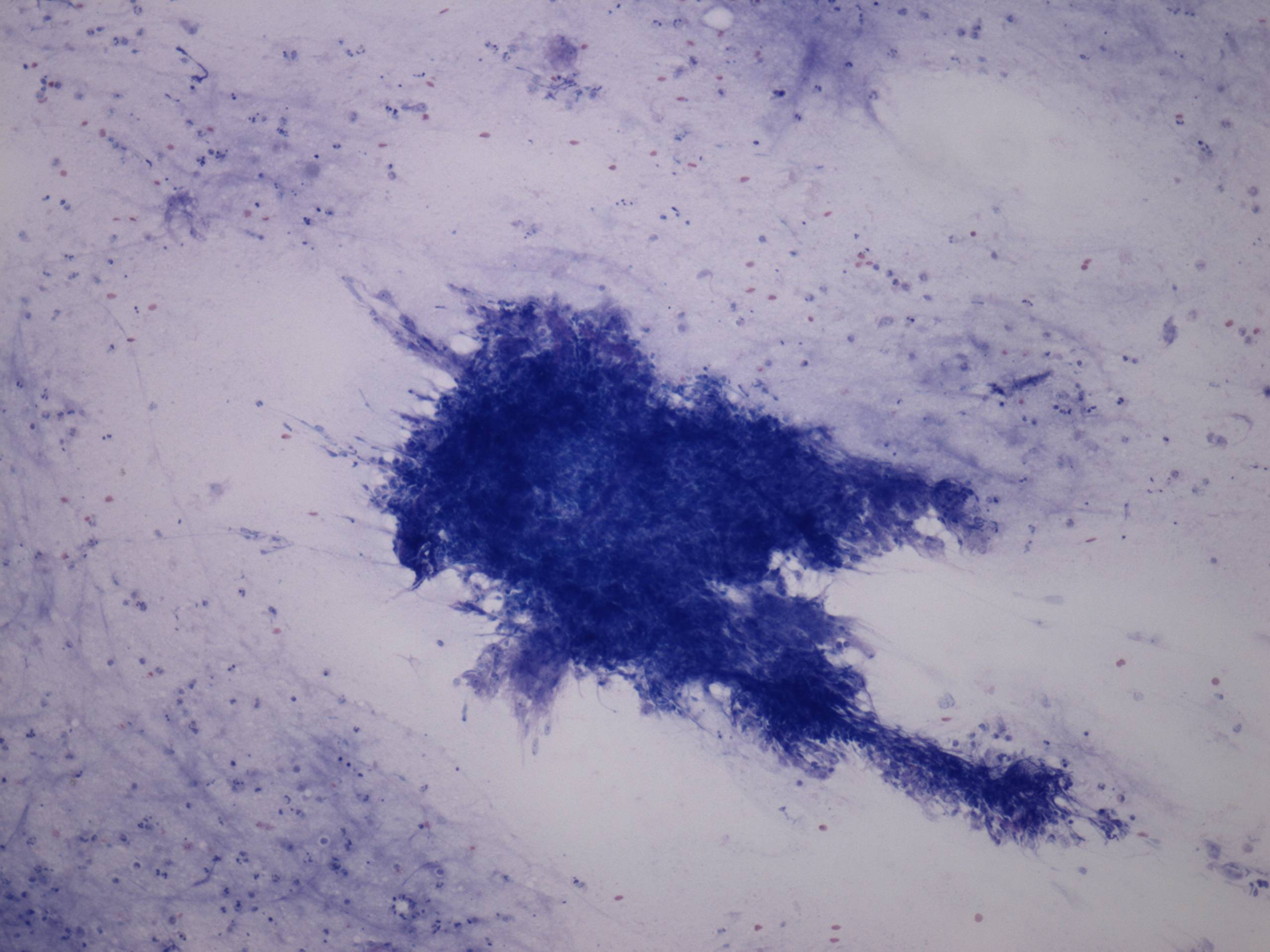Pap-smear, 100x. There is a necrotic fragment in a dirty background.