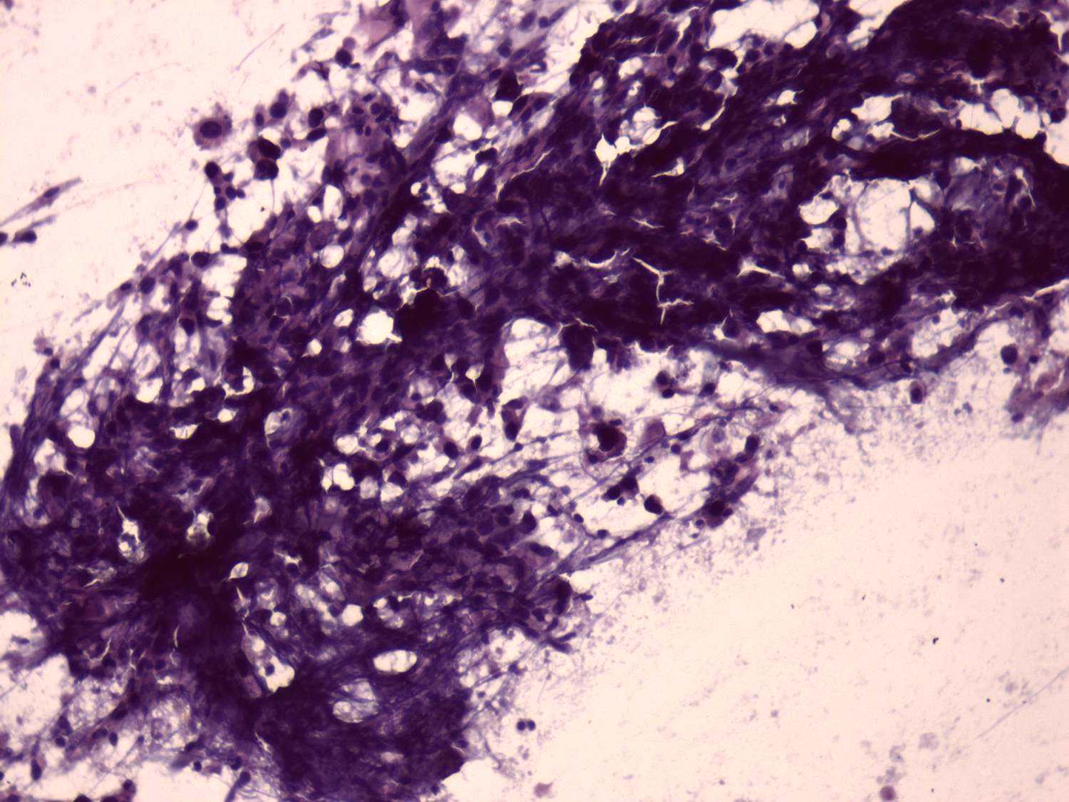 Pap-smear, 200x. A cluster of tumor cells within an inflammatory background.