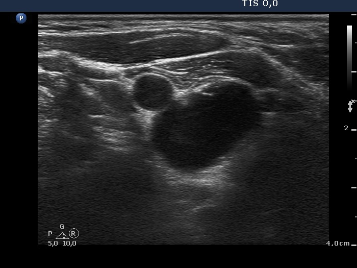 Further laboratory tests aTPO 308 U/mL, calcium 2.25 mM/L, phosphorus 1.11 mM/L, parathormone 40.9 pg/mL (normal range: 10-65). The parathormone content of the cystic fluid was 383 pg/mL.