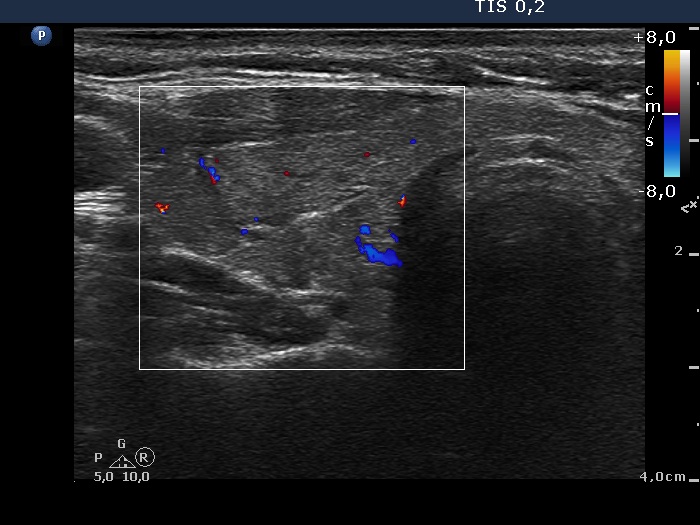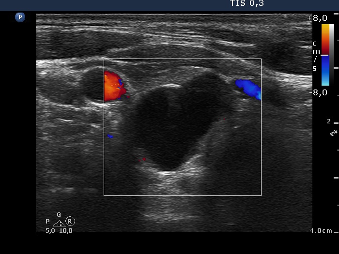 Palpation: An elastic lesion could be palpated in the lower part of the right thyroid.