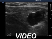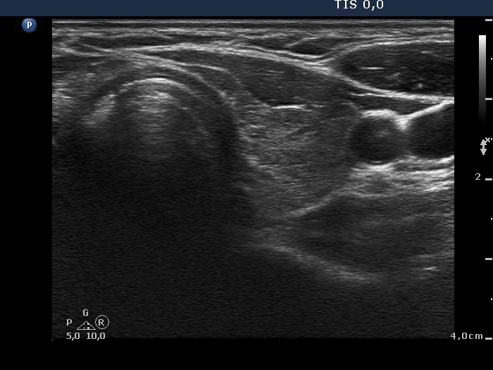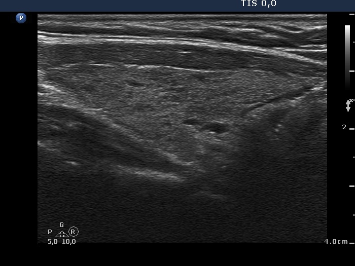 Ultrasonography: The thyroid was minimally-moderately hypoechogenic and presented fibrosis. There was a cystic lesion in the lower dorsal part of the right thyroid bed.