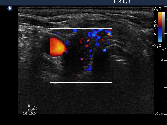 Ultrasonography: The thyroid was hypoechogenic. A distinct lesion was detected which was located lower to the lower pole of the right lobe.