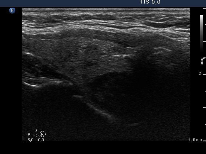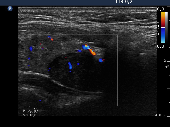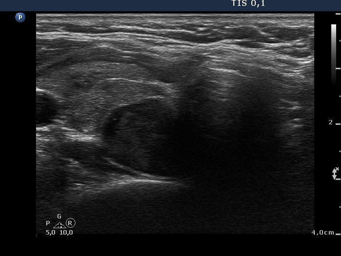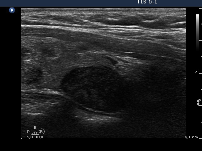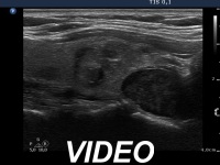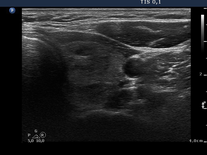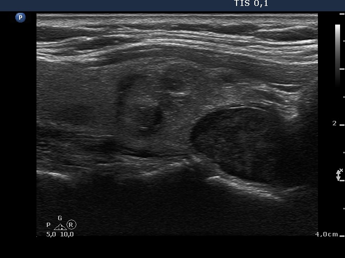 Ultrasonography: The thyroid was echonormal and contained multiple inhomogeneous, hyperechogenic nodules. There was a hypoechogenic lesion in the dorsal part or dorsal to the lower pole of the right lobe.