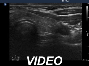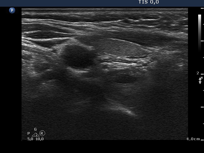 Ultrasonography. The thyroid was minimally hypoechoic and had several insignificant hypoechoic lesions. There was a solid-cystic mass dorsal to the lower pole of the right lobe.