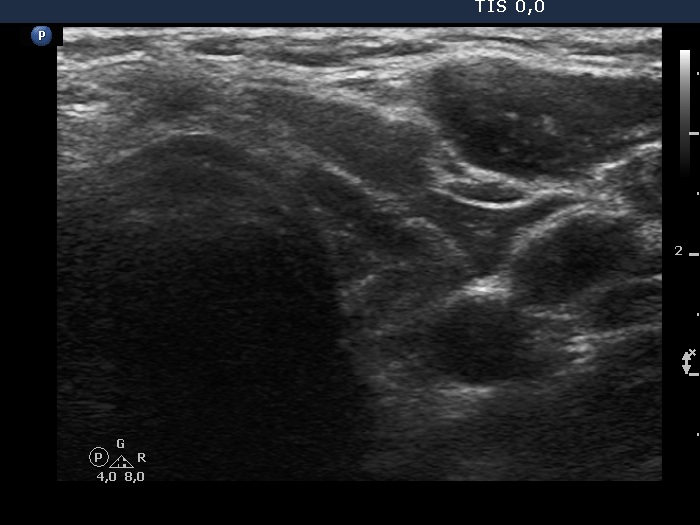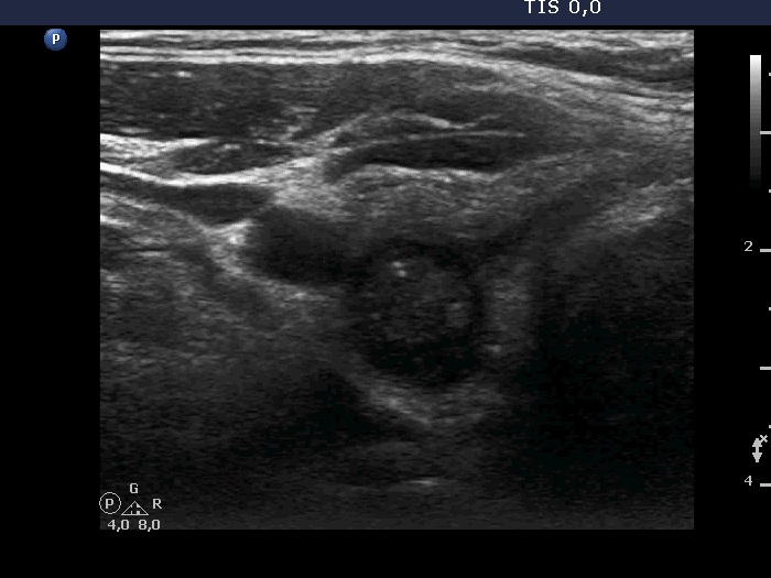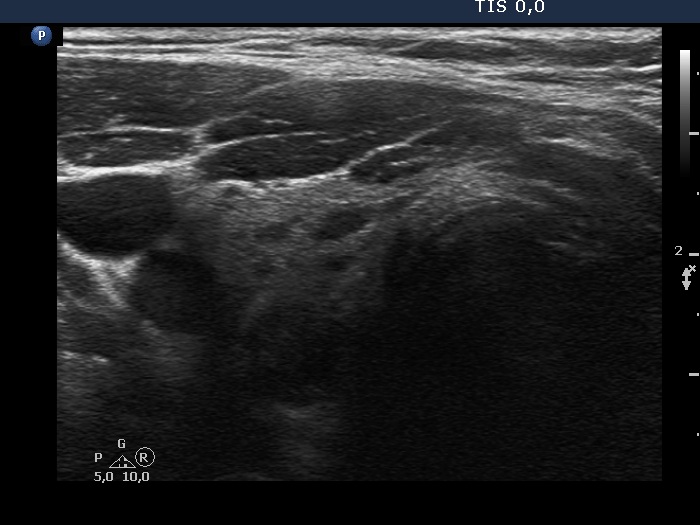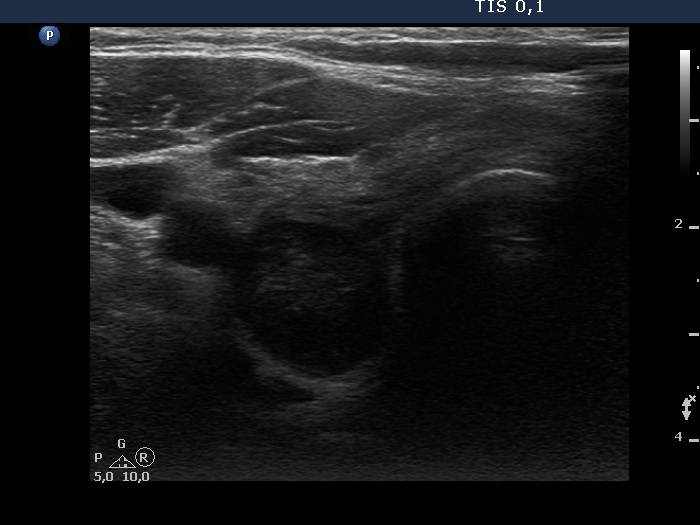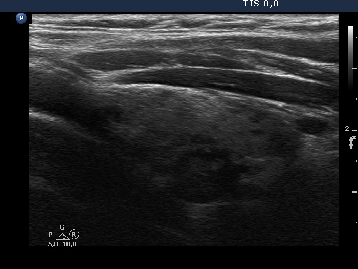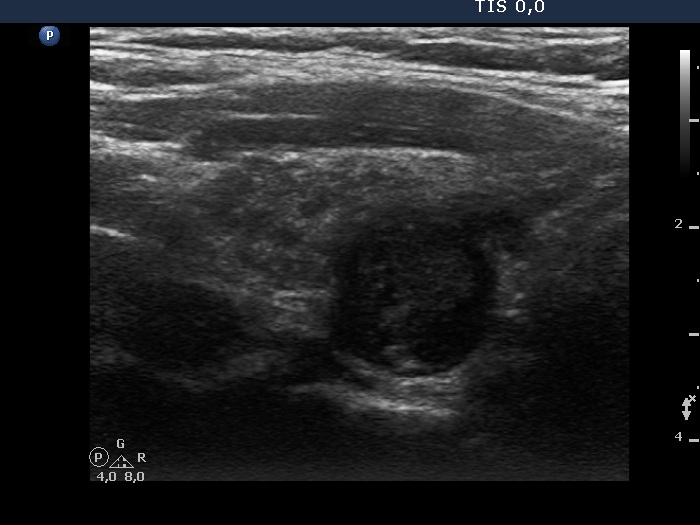 The discrete lesion showed see features on which a different pathology could be suspected: in contrast with other hypoechoic smaller areas, the larger lesion was more hypoechoic, had a more regular shape and had microcalcification.
