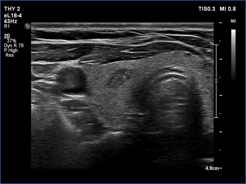 Ultrasonography. The thyroid was echonormal. There were several minimally hypoechoic discrete lesions in both lobes. Corresponding to the palpable nodule, a mixed, solid-cystic nodule was found which had spongiform areas. The solid part was minimally/moderately hypoechoic. The lesion did not show halo and presented neither intranodular nor perinodular blood flow.