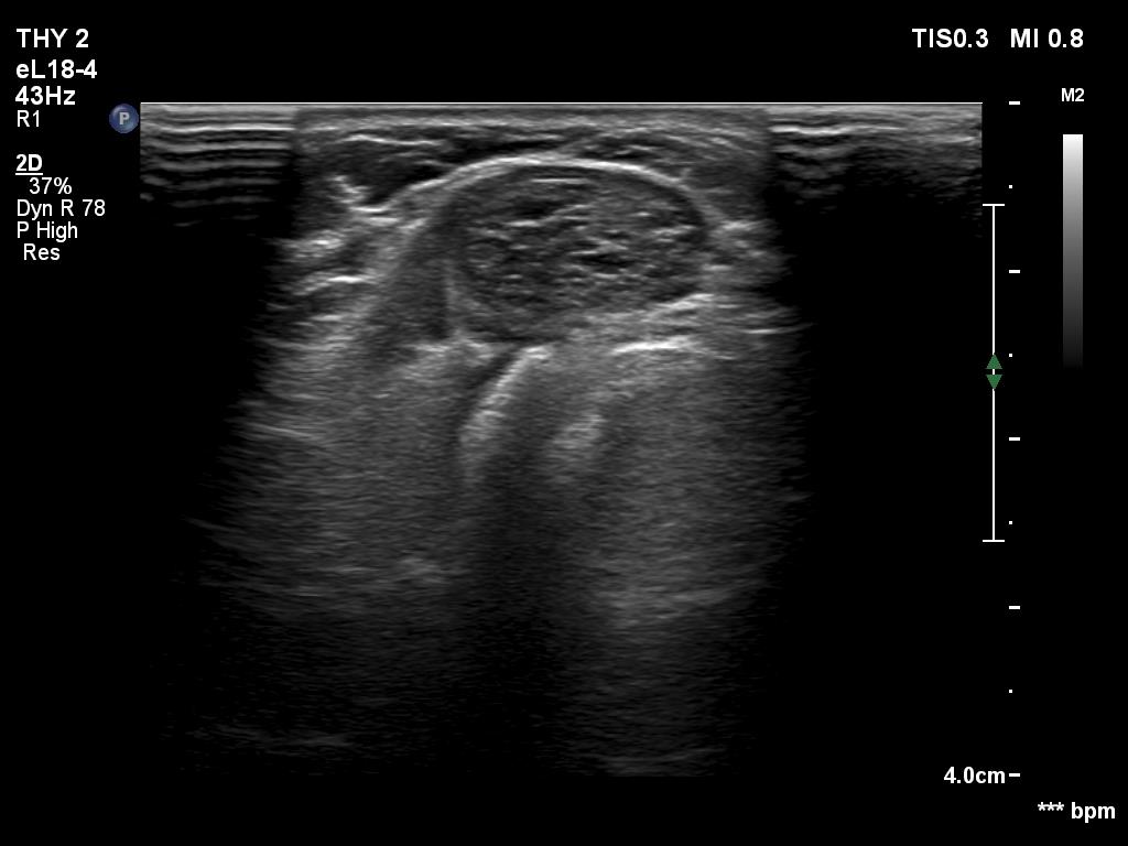 Suggestion. I told the patient that based on the ultrasound pattern of the nodule, the risk of malignancy was extremely low. I suggested that unless it bothers her aesthetically, it is not worth having surgery. A repeat ultrasound was advised in a year.