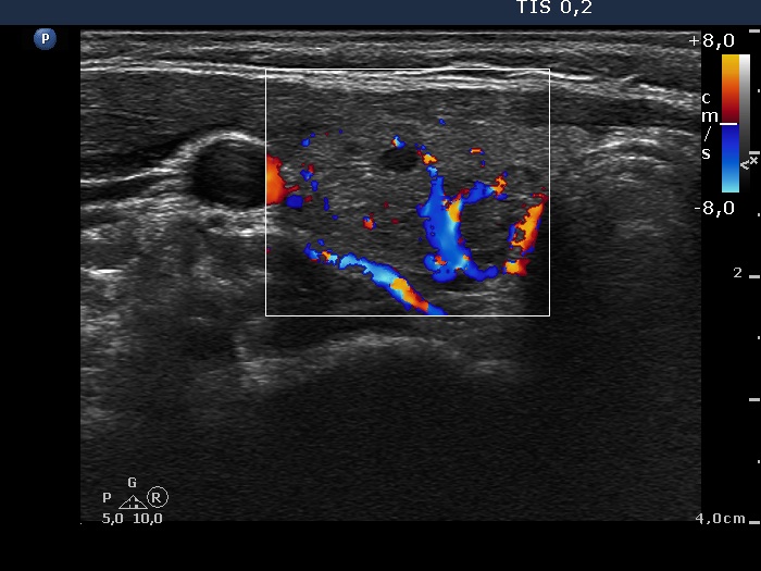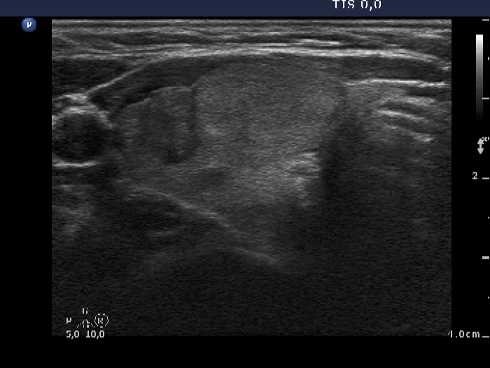Ultrasonography. The thyroid was echonormal. There were multiple moderately hypoechogenic lesions in the right lobe. The palpable nodule was echonormal and presented halo sign and perinodular blood flow.