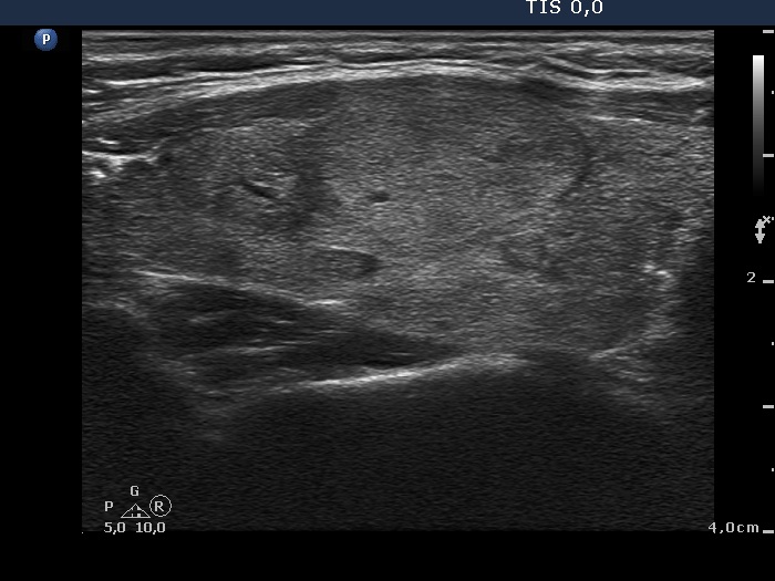 Taking the ultrasound presentation into account, the risk of oxyphilic tumor was even lower because the ultrasound pattern corresponds either to hyperplastic nodules or to an autoimmune thyroiditis.