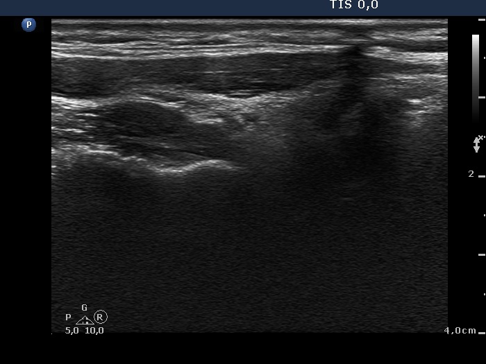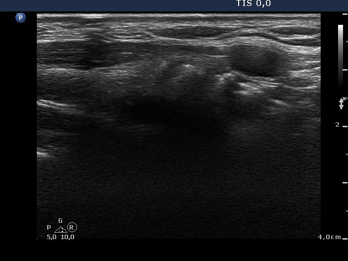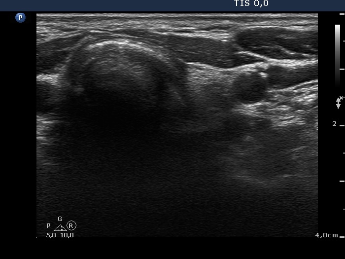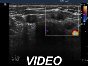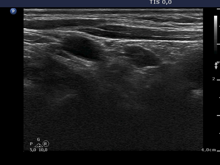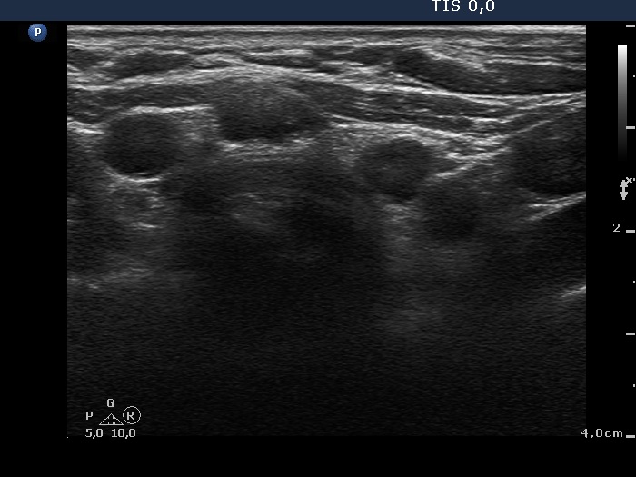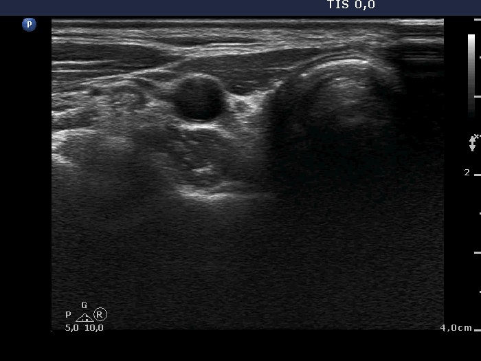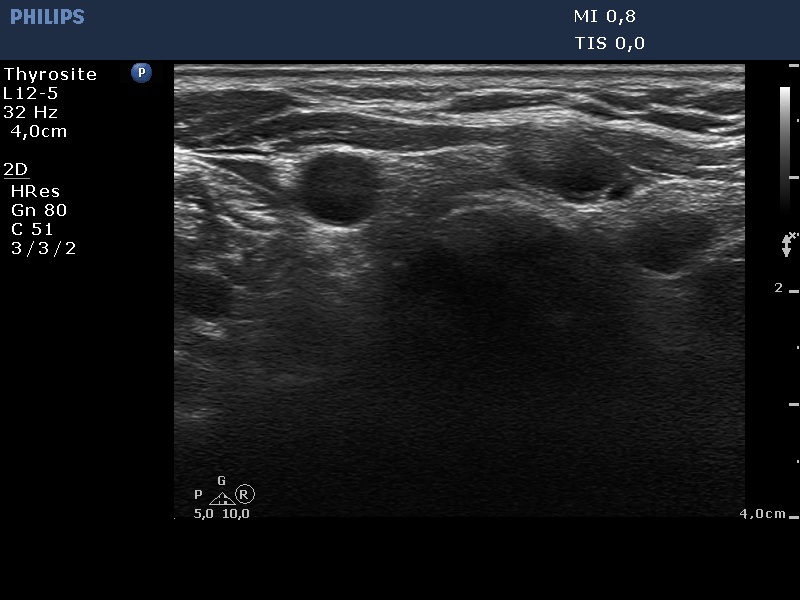 Clinical data: A 47-year-old woman requested a second opinion. She has been operated for a T3, conventional-type of papillary cancer for 4 years. Total thyroidectomy and radioiodine therapy were performed and she was regularly checked for thyroglobulin which was always undetectable. Recently, two lesions suspicious of recurrence were described on ultrasound.