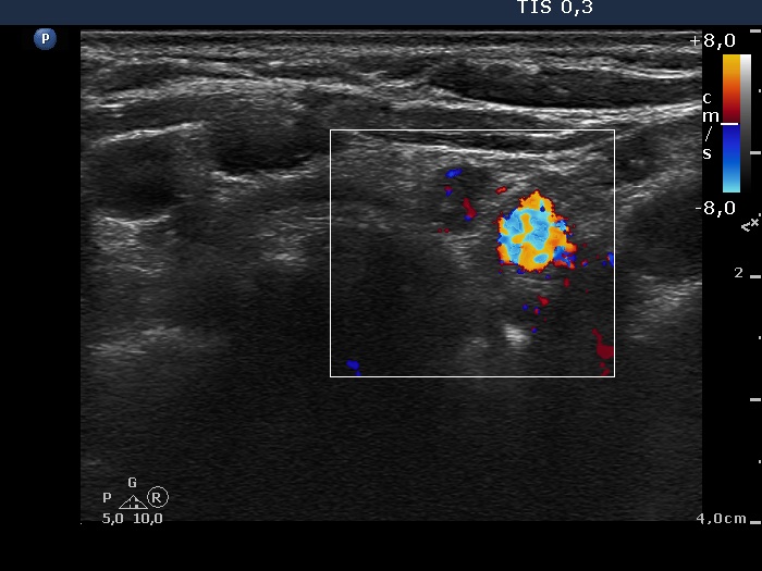 Comment. The presentations of the hypoechoic lesion in all three sites were the same, they differed only in their size. Naturally, the two larger in the isthmus and in the left thyroid bed could cause and did cause concern. Especially that in the left lobe due to its intralesional vascularity. The larger lesions can correspond to small muscle fibers, remnant of the regenerative provess after the surgery but even damaged, non-viable thyroid tissue. Taking the thyroglobulin level into account, the risk of thyroid cancer is minimal but not zero.