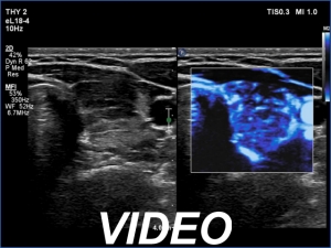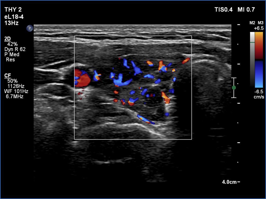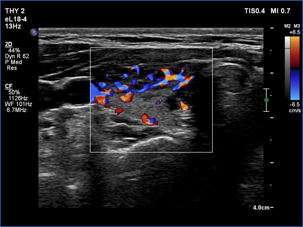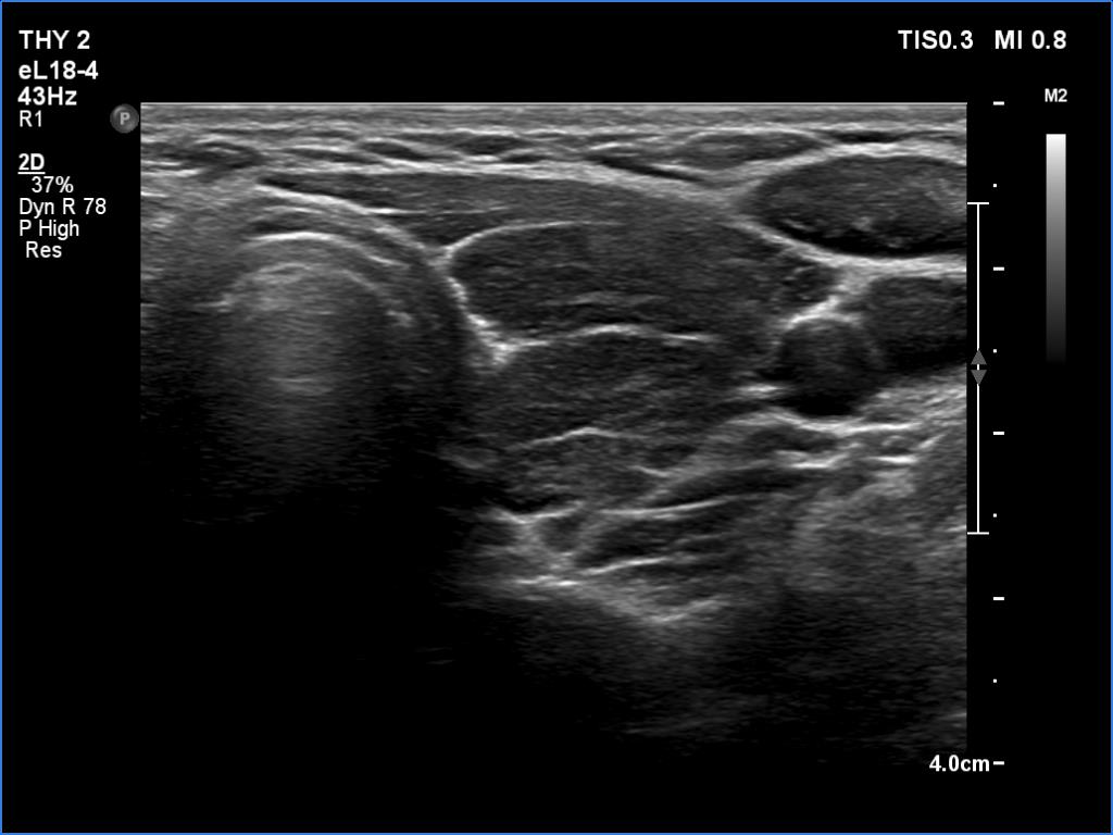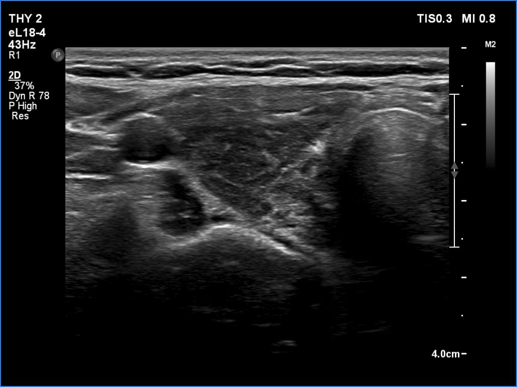 Ultrasonography. In contrast to the previous examination, the entire thyroid became hypoechoic. There were only small islets with less hypoechoic pattern.