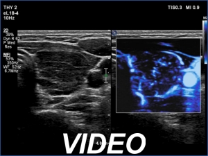 Ultrasonography. The thyroid was echonormal and presented numerous hypoechogenic discrete areas. The echogenicity index was around 30% and 60%, right and left lobe, respectively. None of the discrete areas corresponded to pathological nodule.