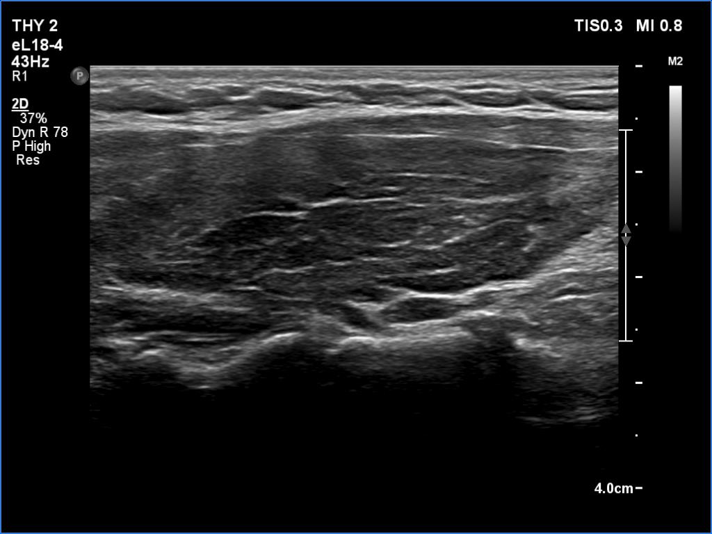 Comment. The patient presented a post partum thyroiditis, i.e., the underlying autoimmune thyroiditis became more active. The change in ultrasound pattern is also in line with this. Be aware the rapid change in ultrasound pattern. In other cases, the echogenicity can change in years, rather decades in the case of a hypothyroidism. The structure is expected to show the pattern seen in the first study a year later.Clinical data: Half a year ago, the patient gave birth. She took 100 microgram of medicine a day in the second half of the pregnancy, and after giving birth she returned to the previously used dose of 50 micrograms a day. She gained 8 kg in the last three months and had other symptoms which suggested underdosing.