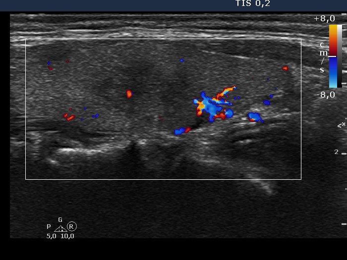 Right lobe, longitudinal view, color Doppler mode.