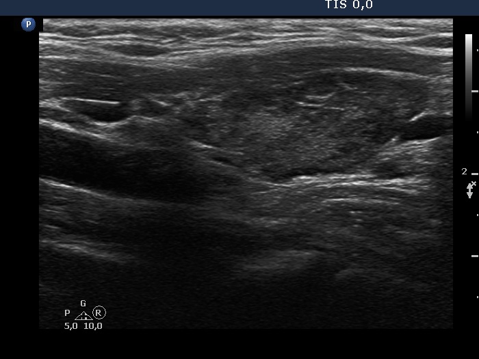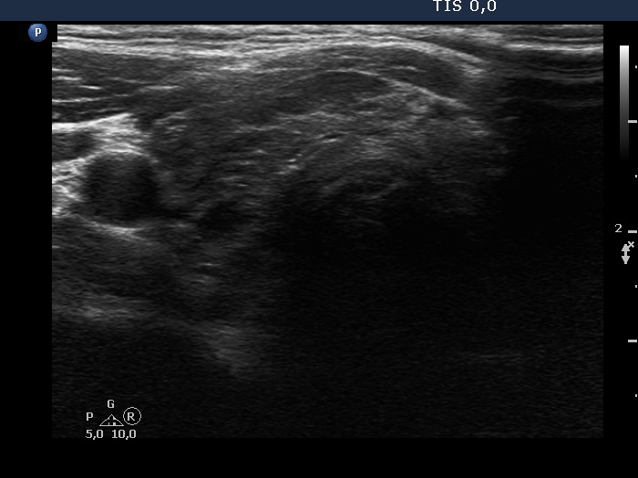 Clinical presentation: A 38-year-old woman was referred for aspiration cytology. Previous ultrasound reports were equivocal whether the thyroid had nodules or not. This caused anxiety to the patient. The patient had been treated for hypothyroidism for three years.